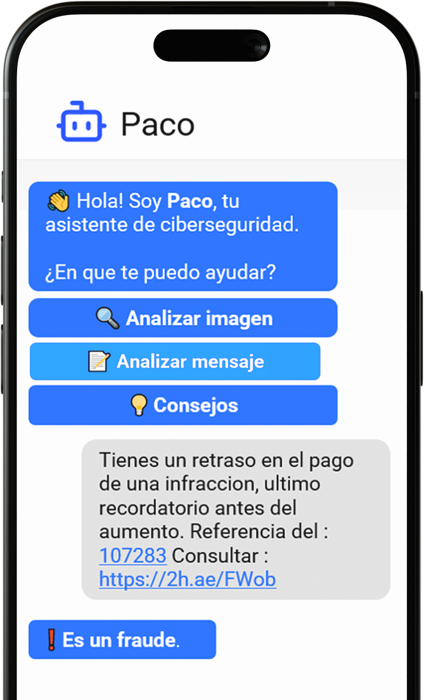 Paco identifica enlaces fraudulentos y te asesora para mantenerte protegido en todo momento.
